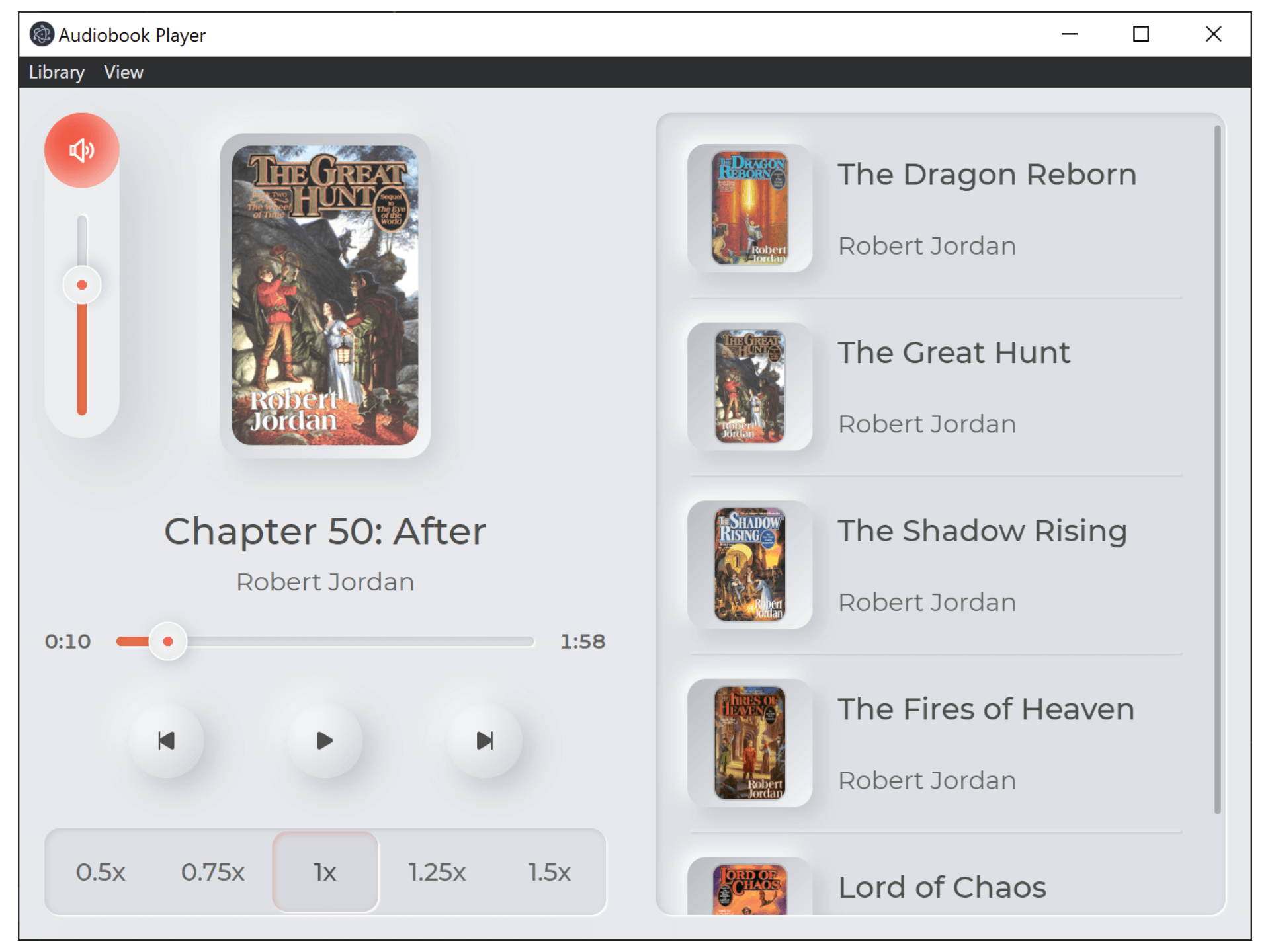 Desktop audiobook player application created with Electron and React. Designed to be simple and easy to use. Features include automatic saving of playback position, adjustable playback speed, and light/dark mode.